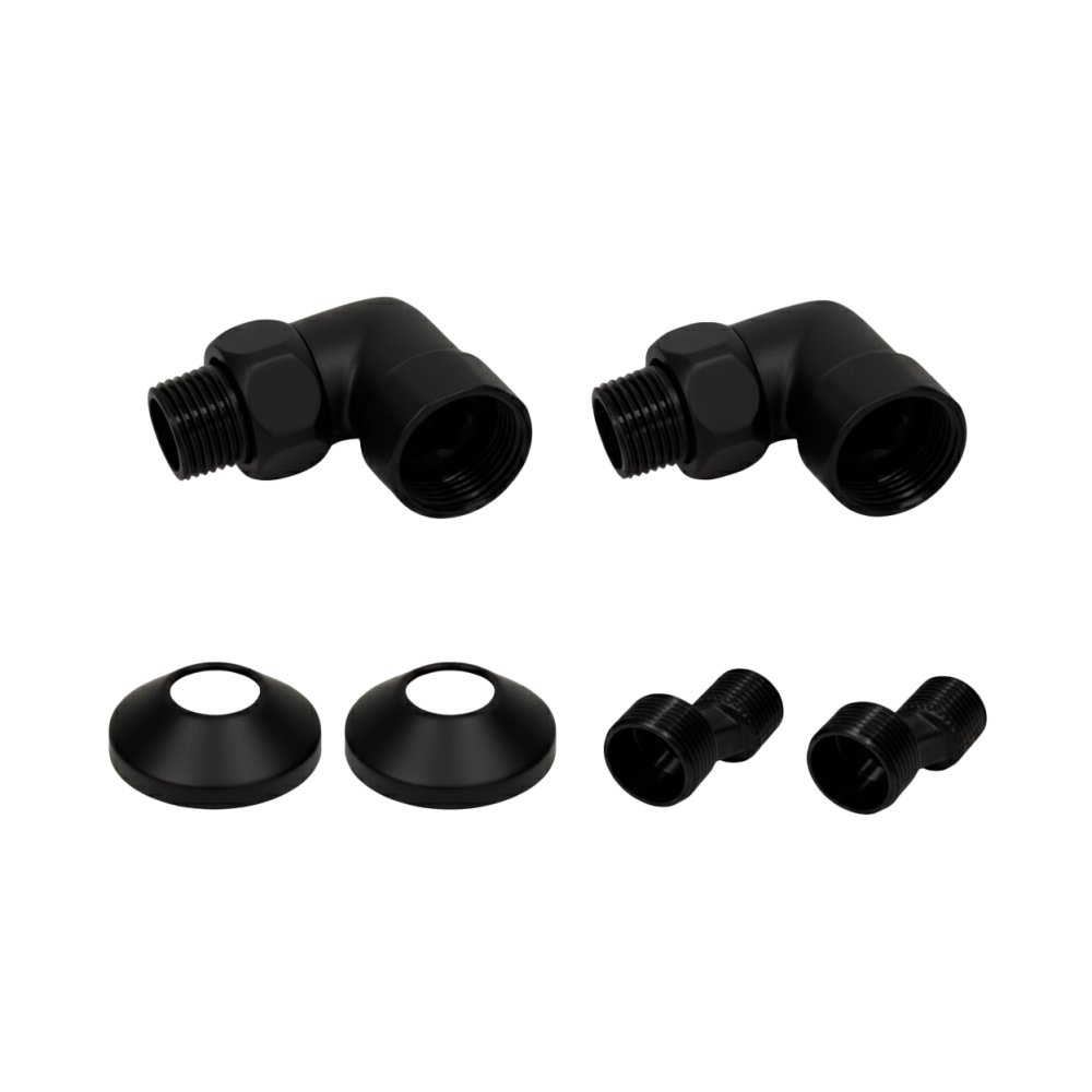 - Комплекты для нижнего подключения водяных ПС 3/4" х 1/2" уголок со сгоном Черный