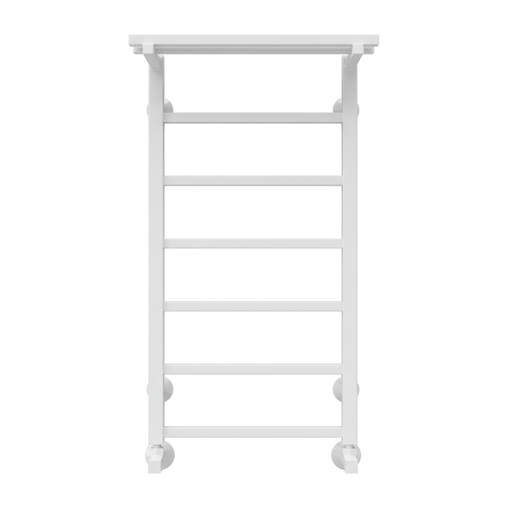 Модель "Контур с полкой" относится к линейке в стиле хай-тек, тяготеющей к лаконичным формам и хромированным поверхностям, и отличается наличием дополнительной прогреваемой полки для хранения и сушки полотенец.