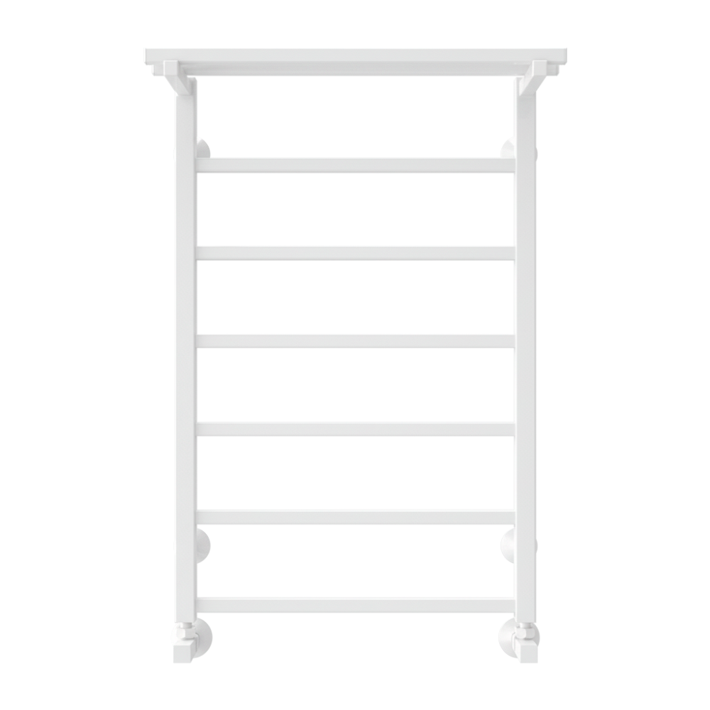 Модель "Контур с полкой" относится к линейке в стиле хай-тек, тяготеющей к лаконичным формам и хромированным поверхностям, и отличается наличием дополнительной прогреваемой полки для хранения и сушки полотенец.