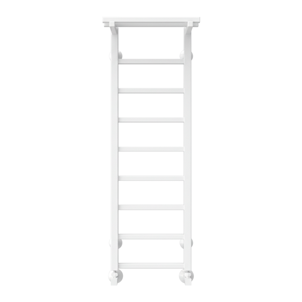 Модель "Контур с полкой" относится к линейке в стиле хай-тек, тяготеющей к лаконичным формам и хромированным поверхностям, и отличается наличием дополнительной прогреваемой полки для хранения и сушки полотенец.