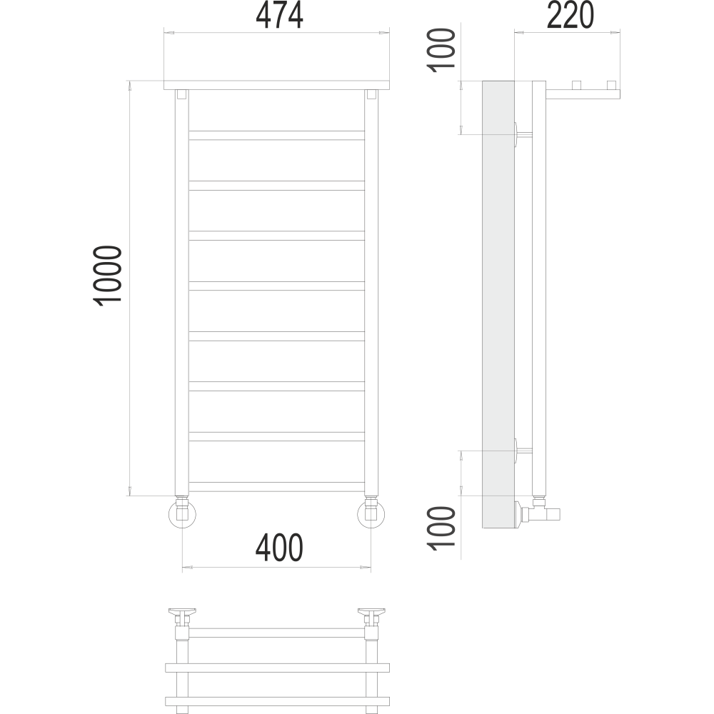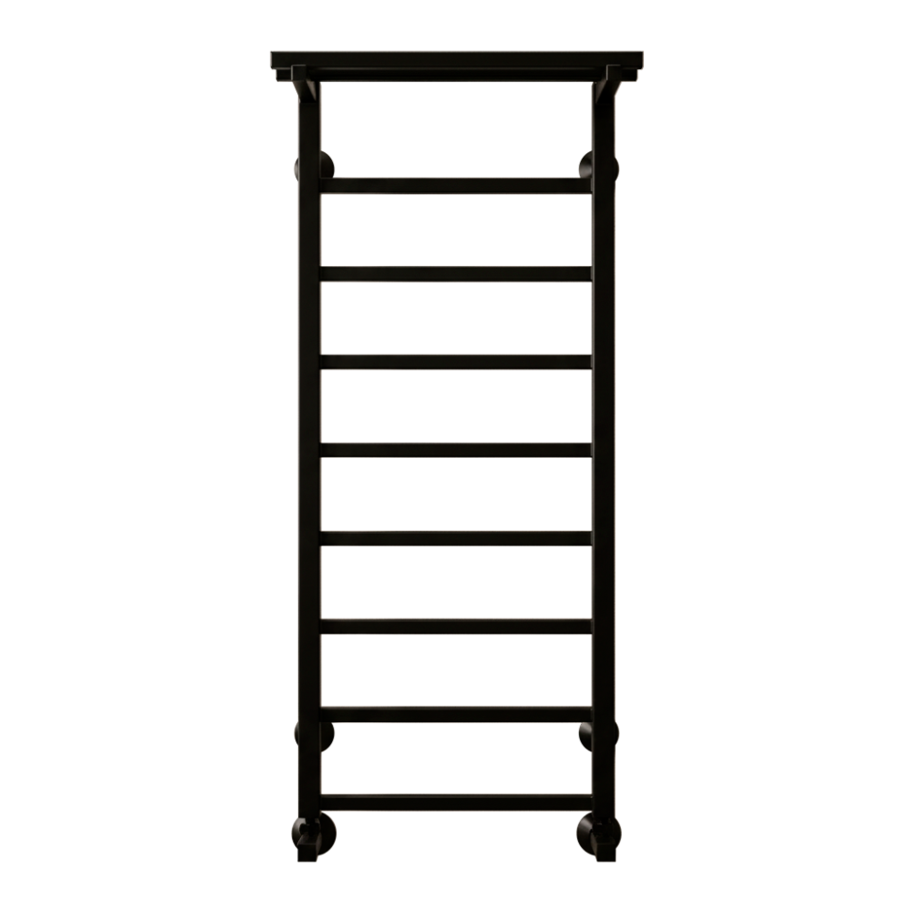 Модель "Контур с полкой" относится к линейке в стиле хай-тек, тяготеющей к лаконичным формам и хромированным поверхностям, и отличается наличием дополнительной прогреваемой полки для хранения и сушки полотенец.