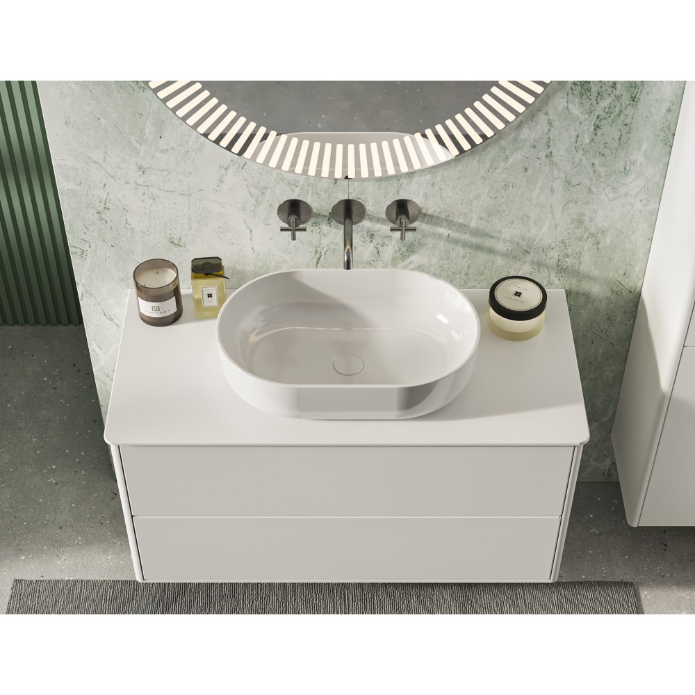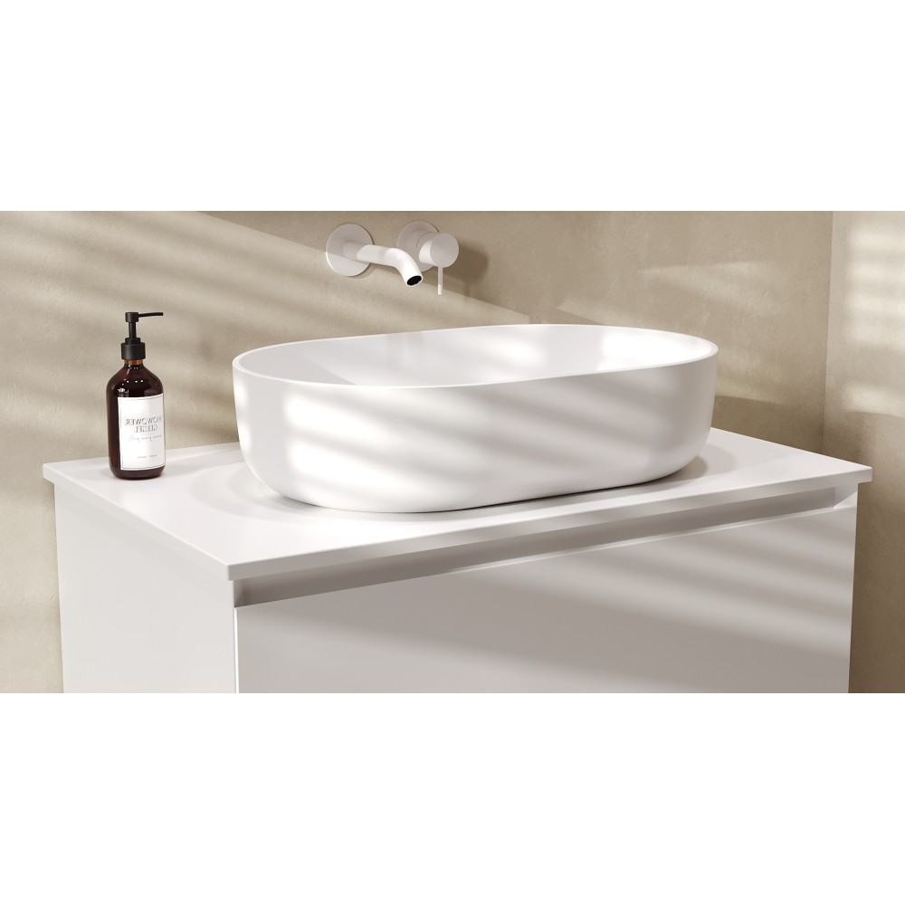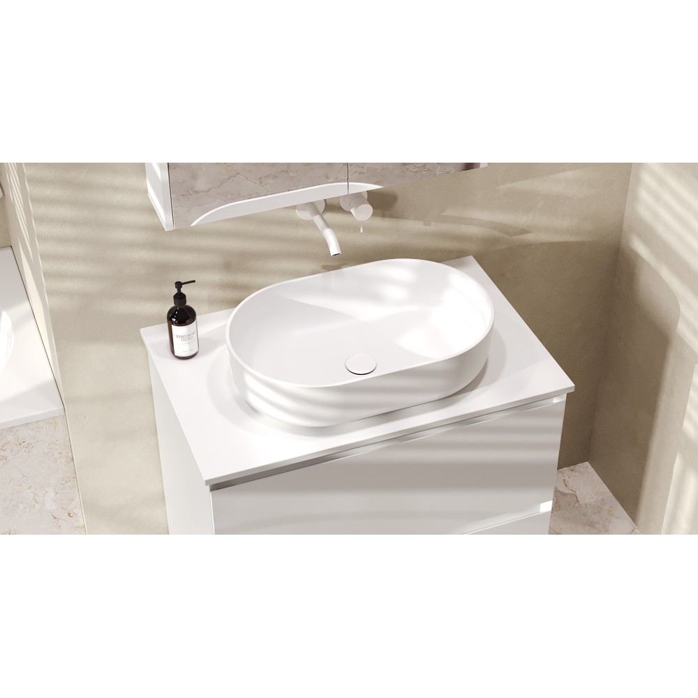 Накладаная раковина Самора устанавливается непосредственно на столешницу или тумбу, создавая визуально привлекательный и современныйакцент в ванной комнате. Овальная форма раковины уникальна для любого интерьера ванной команты. Материал Solid Surface прочный, долговечный и устойчивый к любым чарапинам